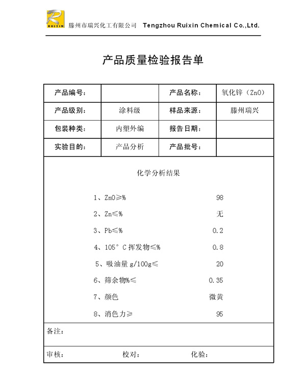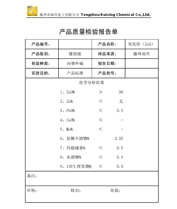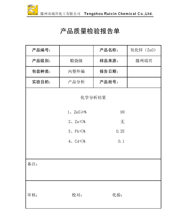 瑞興化工有限公司是生產(chǎn)氧化鋅的重點企業(yè),于2008年通過ISO9001:2008質(zhì)量管理體系認(rèn)證。“瑞興”牌氧化鋅在國內(nèi)擁有較大穩(wěn)定的市場,并遠銷東南亞、中東、中南美等國家和地區(qū),在國內(nèi)外享有較高聲譽。